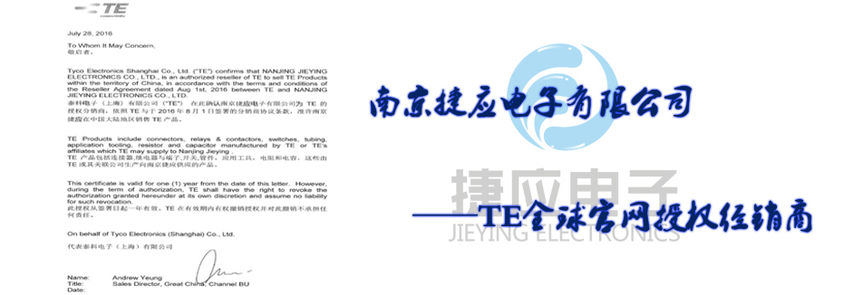 南京捷應電子有限公司是國際無源器件品牌美國泰科電子(TE)在中國華東地區的主要通路商,代理經銷旗下全系列產品包括TYCO(AMP)系列連接器、接插件、OEG、SCHRACK、P&B功率繼電器、美國RACHEM各類航空導線、熱縮套管、模縮套、標識產品、電線電纜。
